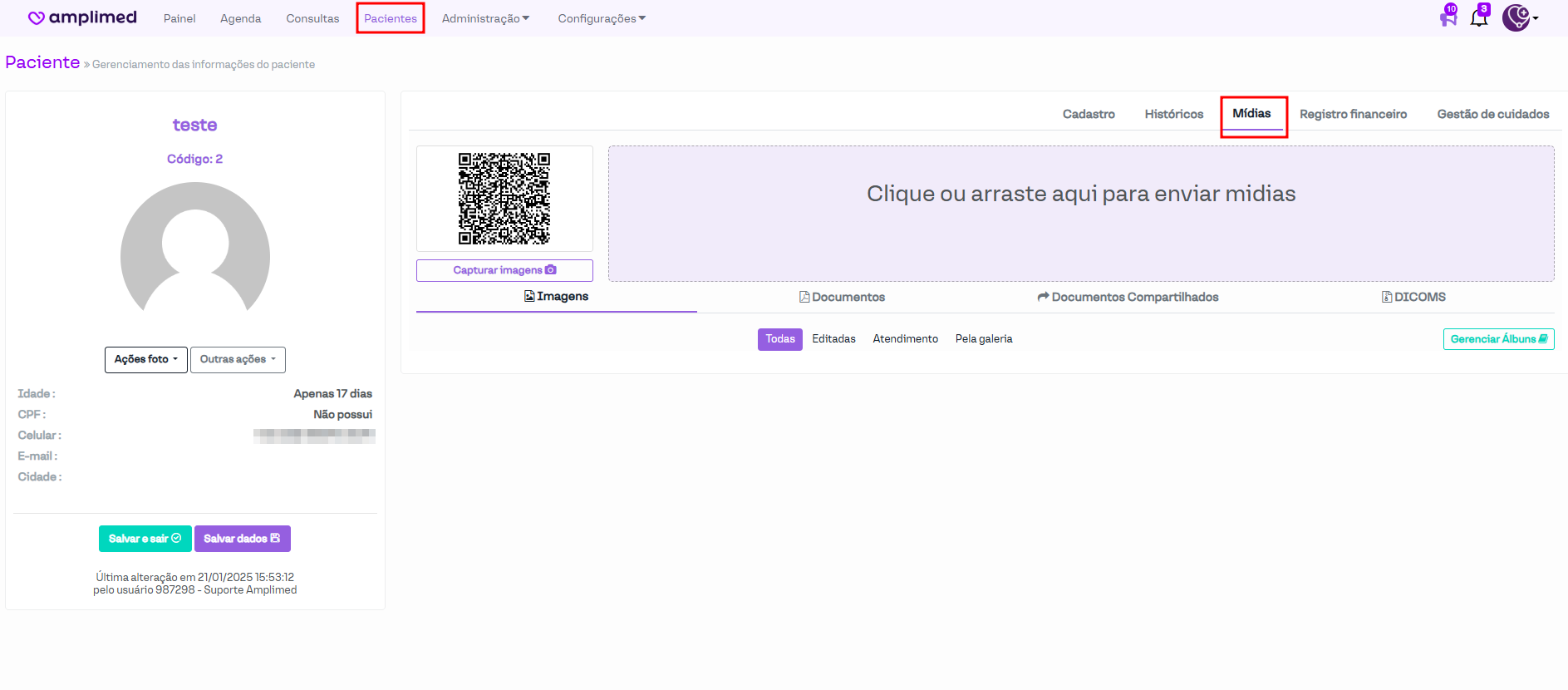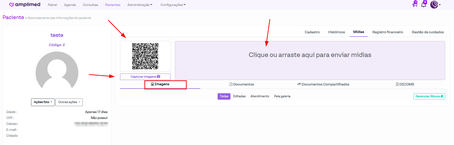 Através do cadastro do paciente é possível anexar Imagens (jpg, png e jpge), documentos (Pdf e txt) e modelos de documentos do tipo DICOMS.