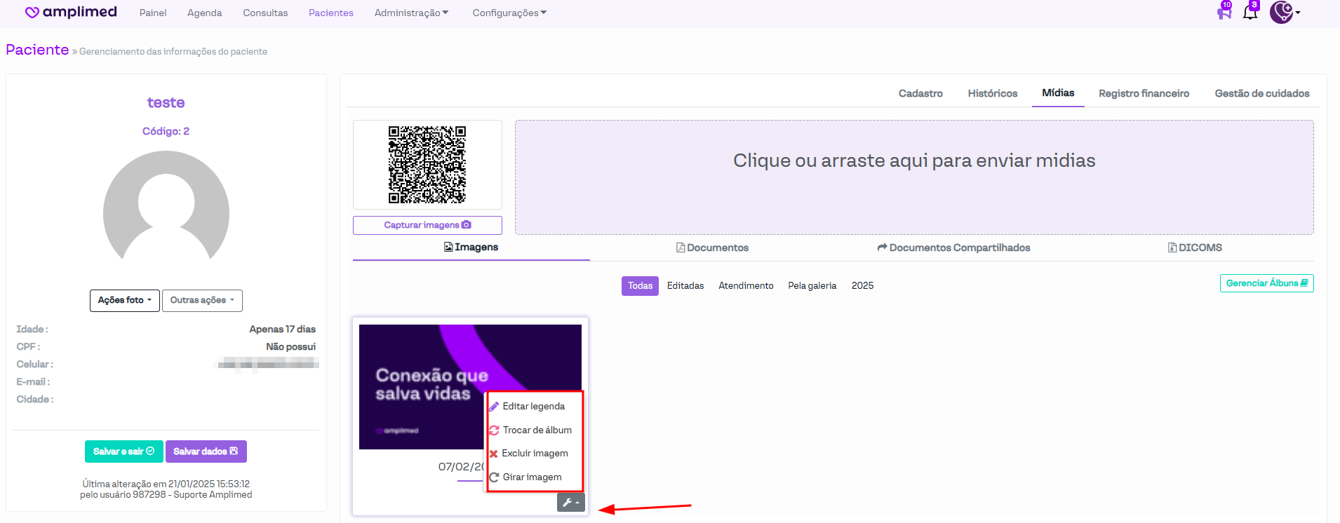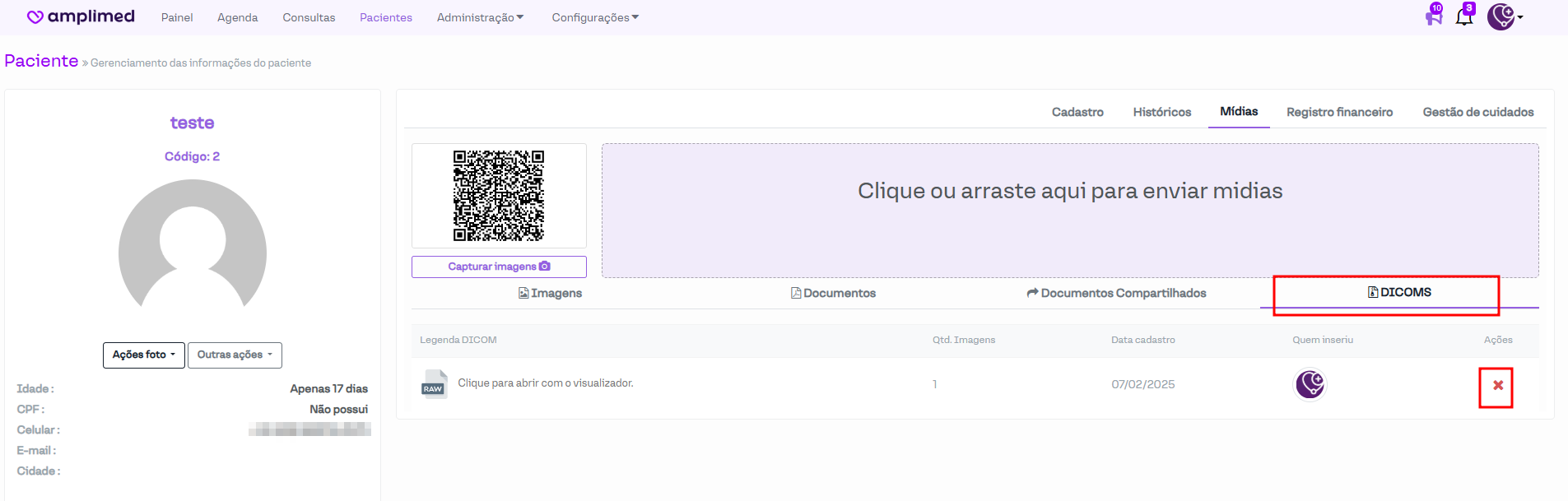 Na aba de DICOMS, poderá anexar arquivo com esse formato e também remove-los caso sejam anexados por essa aba: