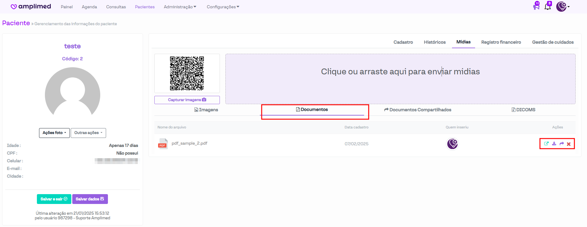 Na aba de Documentos, poderá inserir um arquivo em PDF, assim como poderá baixar um arquivo já anexado, compartilhar ele, abrir ou remover apenas arquivos que foram anexados por essa aba: