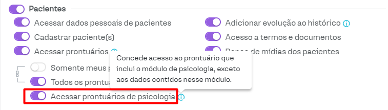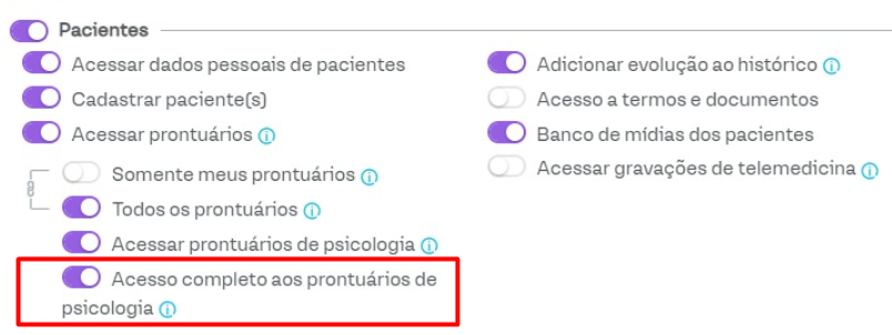 Para os usuários da clínica designados como Responsável Técnico, haverá a opção Acesso completo aos prontuários de psicologia. Esse acesso permite a visualização completa do prontuário, incluindo o prontuário psicológico e os dados preenchidos por outros profissionais no módulo de psicologia.