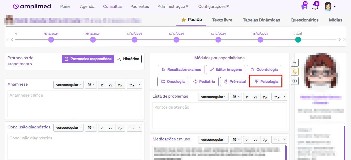 O módulo funciona de maneira simples. Ao clicar no botão de Psicologia, será aberta uma janela na lateral direita, conforme a imagem a seguir.