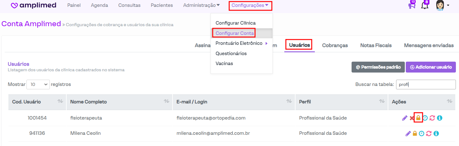 Para configurar os usuários que poderão visualizar os prontuários de psicologia preenchidos, basta acessar Configurar conta > Usuários > Definir permissões (clicando no ícone de cadeado, destacado na imagem abaixo).