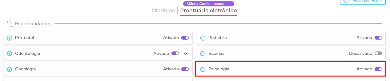 Para ativar esse módulo em seu prontuário, acesse Configurações > Prontuário Eletrônico > Modelos de Prontuário, como demonstrado a seguir.