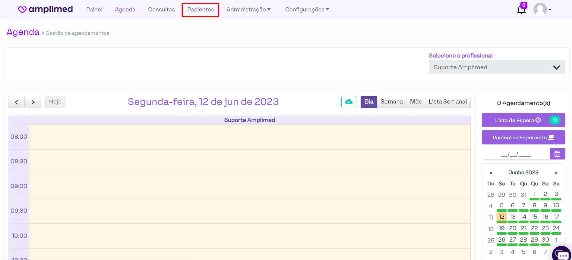 Para realizar o cadastro dos pacientes em sua plataforma Amplimed, siga até o menu principal "Pacientes".