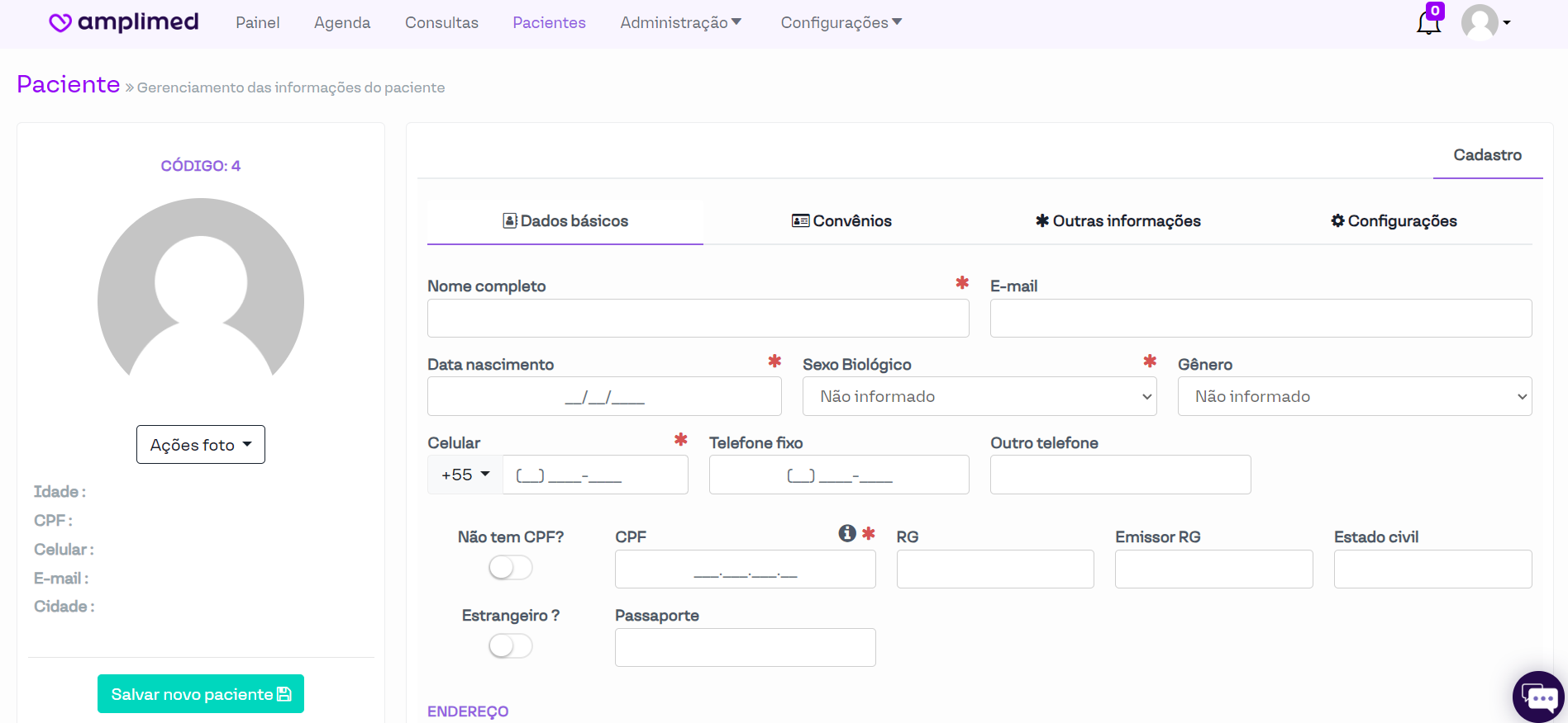 Ao clicar no botão de cadastro, uma nova aba vai nos permitir colocar todas as informações do paciente.