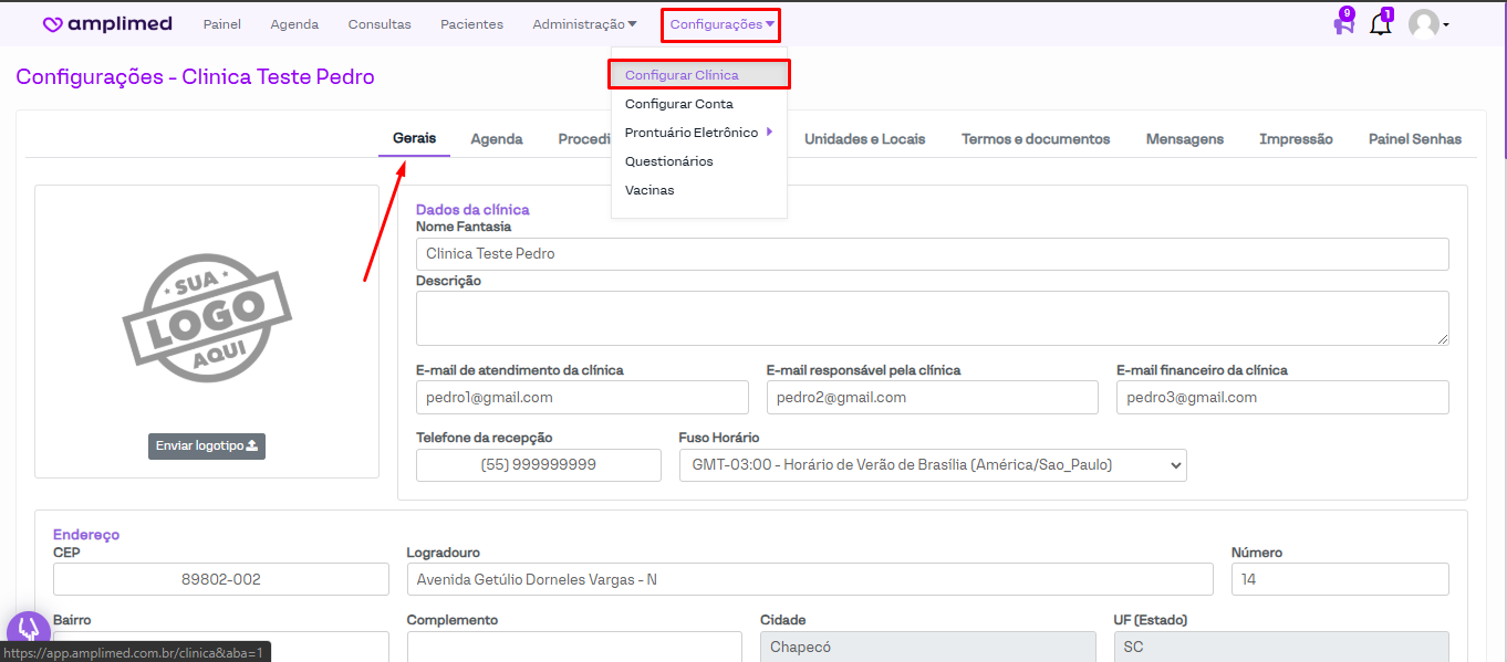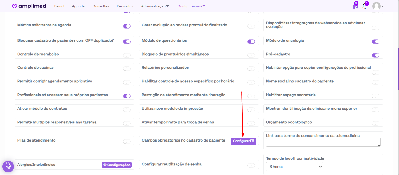 Outro ponto importante que pode impactar no momento do cadastro do paciente, seria os campos obrigatórios, para altera-los, basta acessar Configurações > Configurar Clinica > Gerais > Campos obrigatórios no cadastro do paciente: