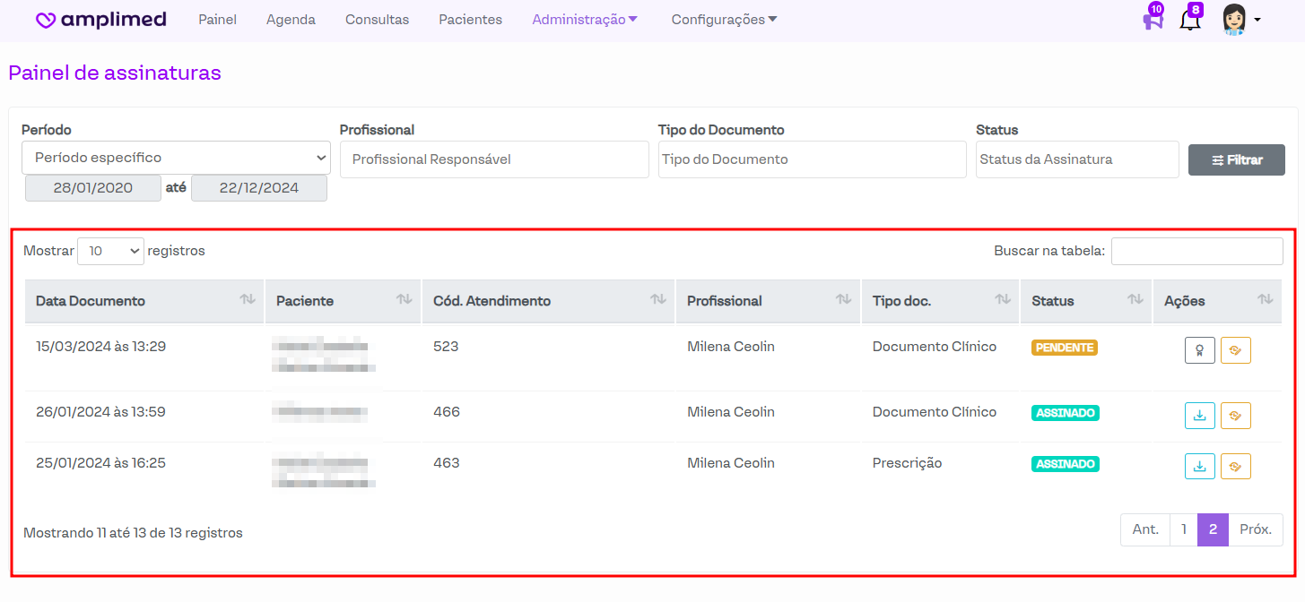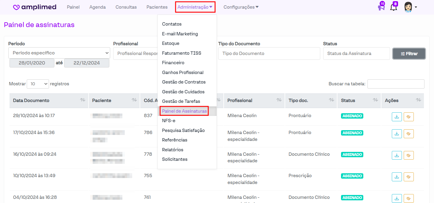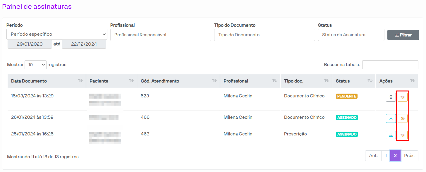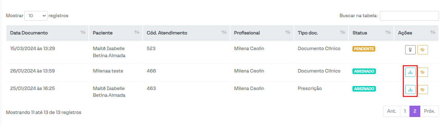 Para usuários do tipo Profissional de Saúde que não possuem permissão de administrador, é possível visualizar apenas os documentos assinados por seu próprio usuário.