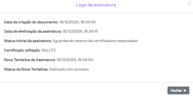 Ao clicar no botão destacado na imagem acima, em seguida uma janela é aberta com o histórico das ações realizadas na assinatura do documento, conforme imagem abaixo.