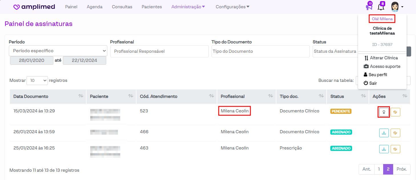Vale destacar que um atendimento pode gerar vários documentos assinados, pois é possível assinar prescrições, documentos clínicos, o prontuário, entre outros.