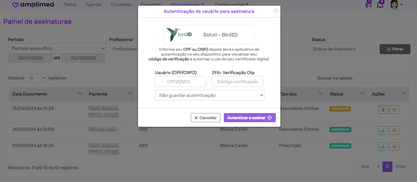 Ao clicar no botão destacado na imagem acima, o sistema solicitará os dados da assinatura digital para tentar assiná-lo novamente. Abaixo está uma imagem da janela aberta no caso de um profissional que utiliza o certificado digital da SOLUTI.