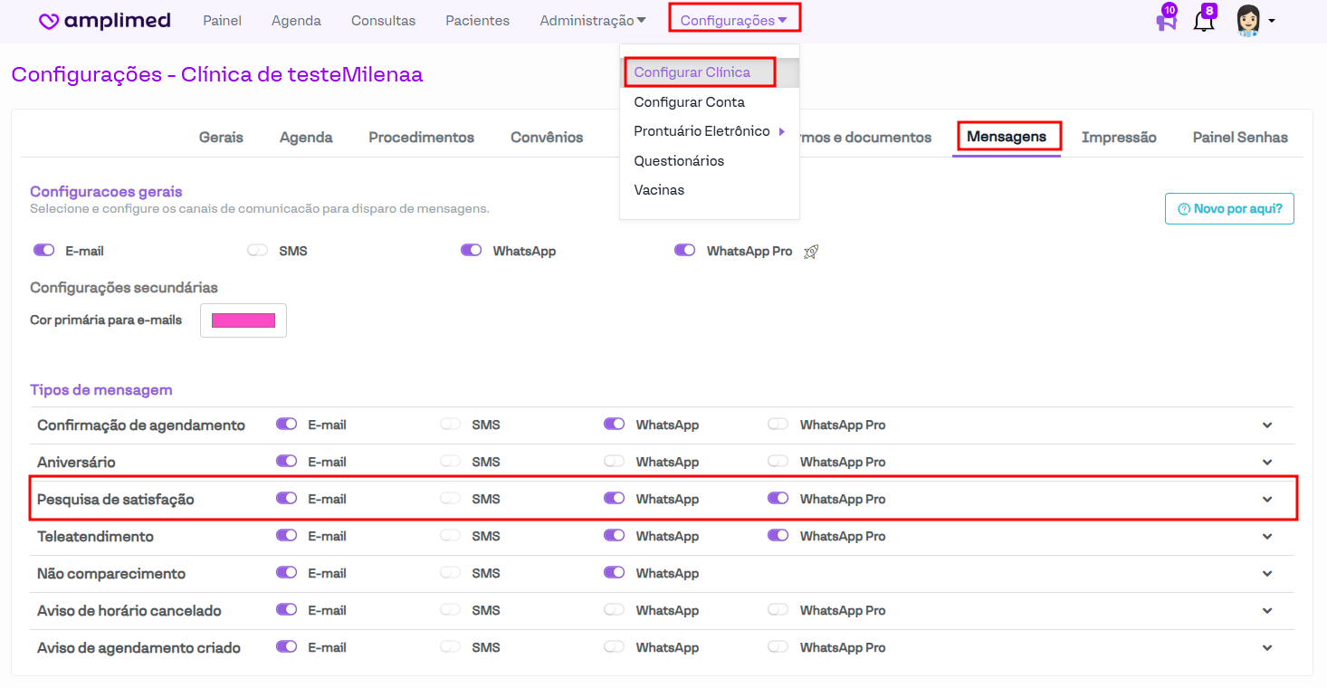 Para ativar o envio, basta acessar Configurações > Configurar Clínica > Mensagens > Pesquisa de Satisfação.