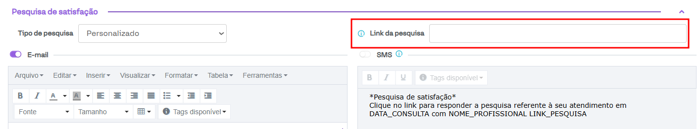 Também é possível ativar pesquisa de satisfação personalizada, a qual permite incluir um link de uma pesquisa de satisfação personalizada pela clínica.