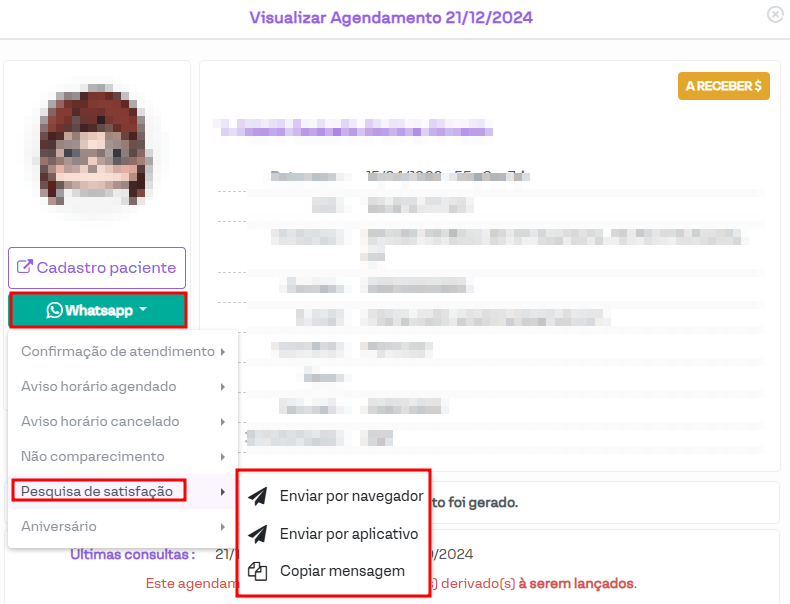 Além disso, é possível encaminhar a pesquisa manualmente por meio da agenda, clicando no botão WhatsApp > Pesquisa de Satisfação.