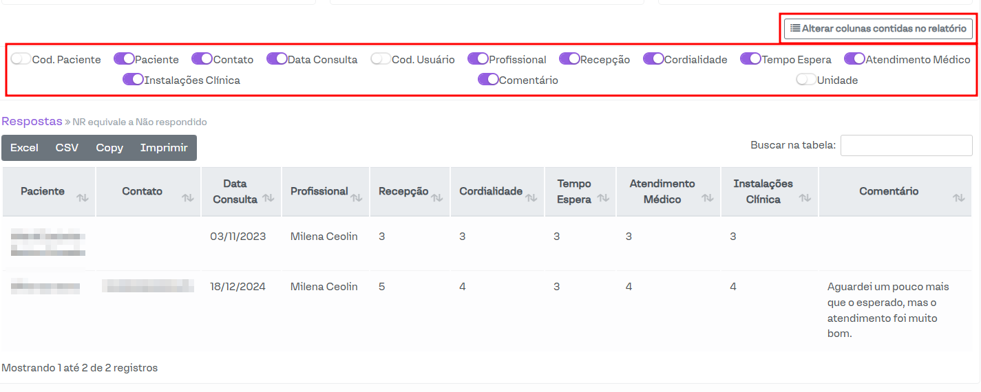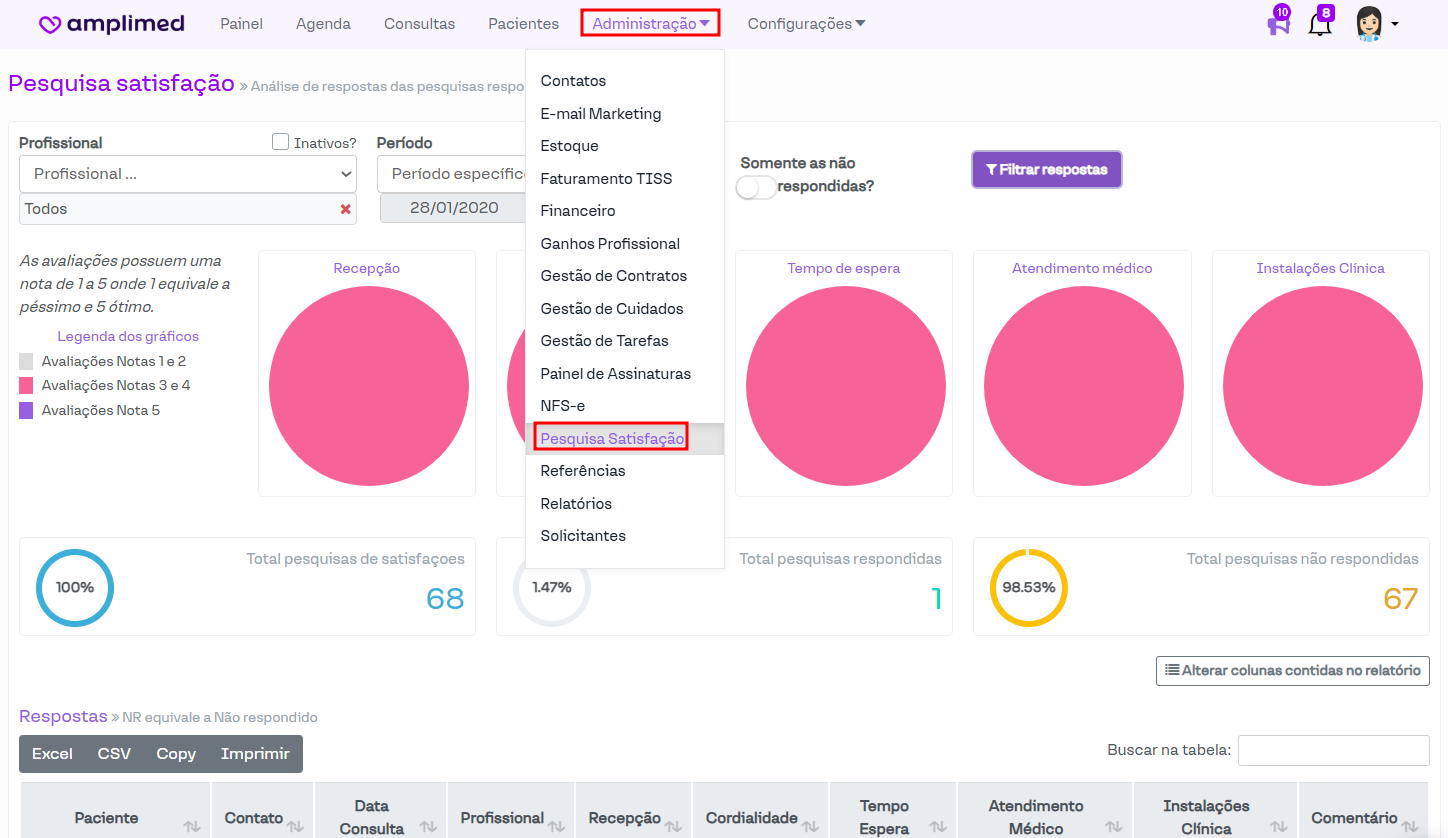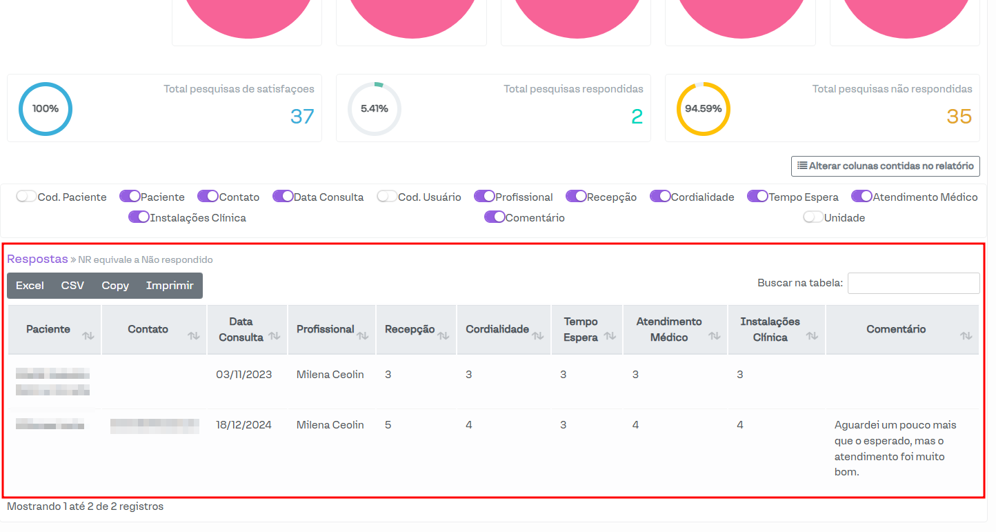 Por fim, uma tabela exibe as pesquisas de satisfação respondidas pelos pacientes. A seguir, mostramos um exemplo dessa tabela.