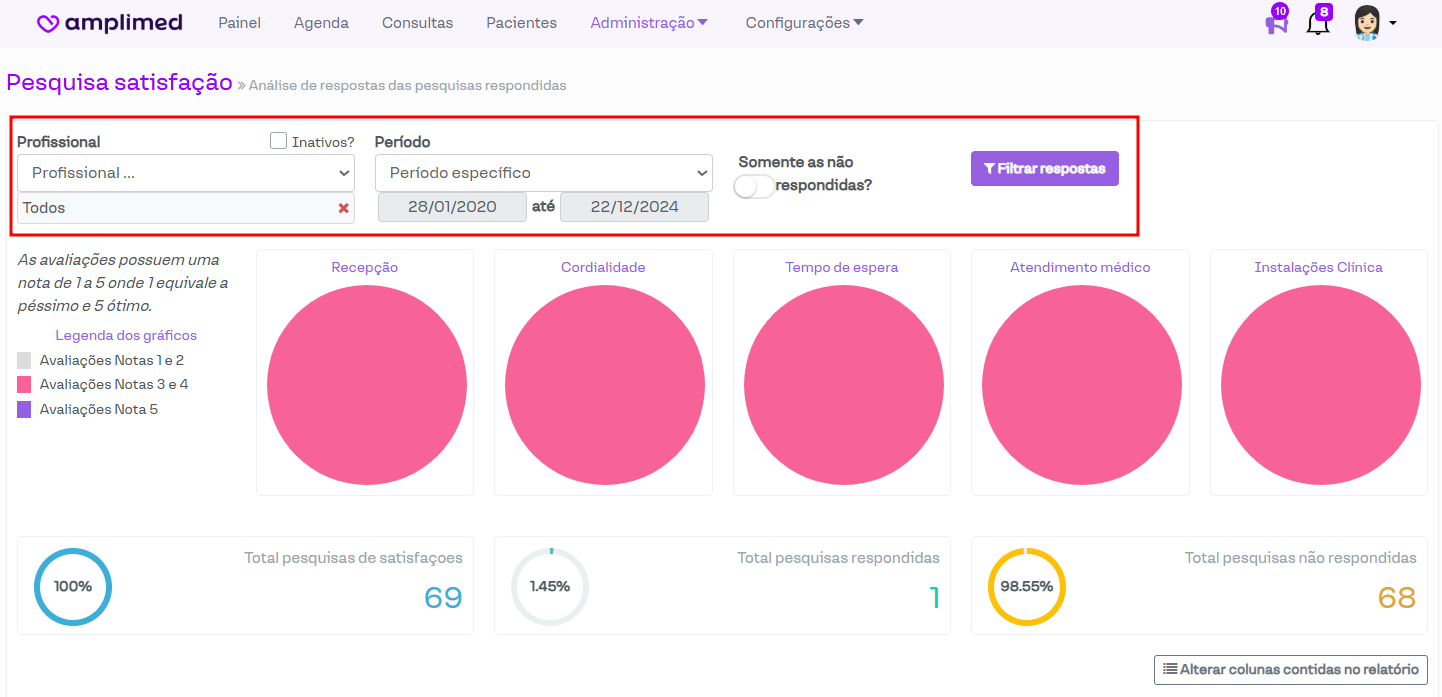 Os filtros permitem refinar as respostas dos pacientes de acordo com o profissional de atendimento, o período de atendimento e a opção de visualizar apenas as pesquisas não respondidas. Após selecionar os filtros desejados, clique em Filtrar Respostas.