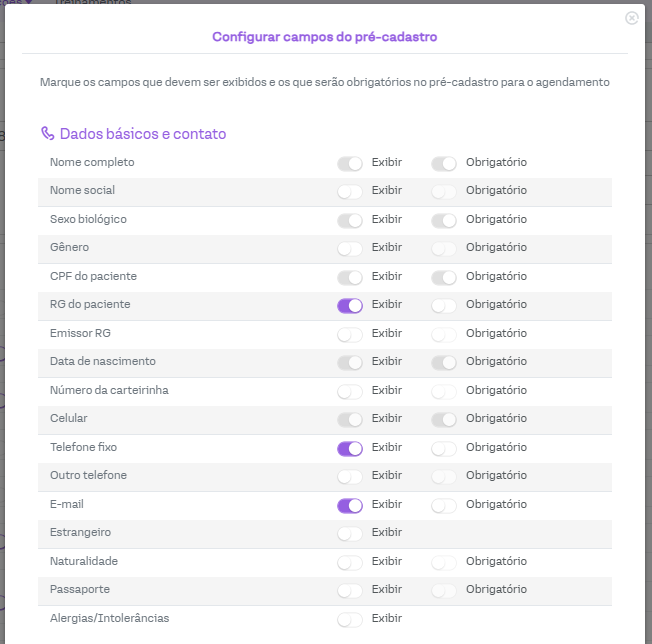 Ao clicar em configurar, será aberto todos os campos configuráveis para o pré cadastro, onde você pode apenas exibir ou torná-los como obrigatórios.