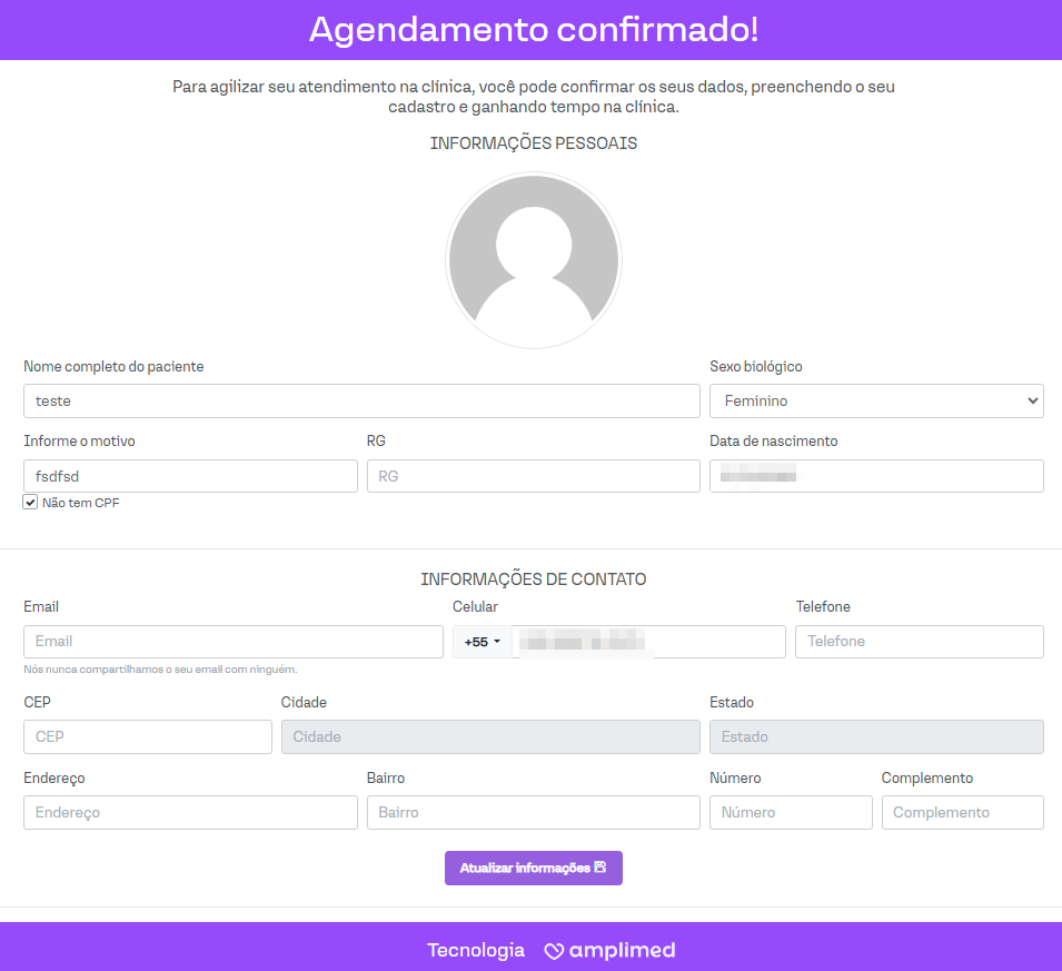 Com o pré-cadastro ativo, quando o paciente receber o link de confirmação de atendimento, ele poderá atualizar os seus dados cadastrais antes de confirmar o agendamento. Isso facilita, pois garante que o cadastro do paciente se mantenha sempre atualizado.