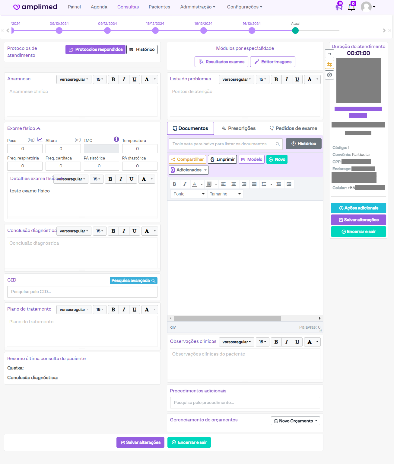 Os campos Anamnese, Exame Físico, Conclusão Diagnóstica, CID, Plano de Tratamento, Lista de Problemas e Observações Clínicas são campos editáveis que permitem a inclusão do conteúdo desejado pelo profisional.
