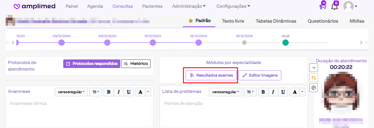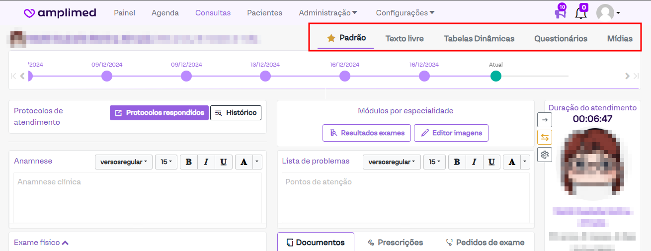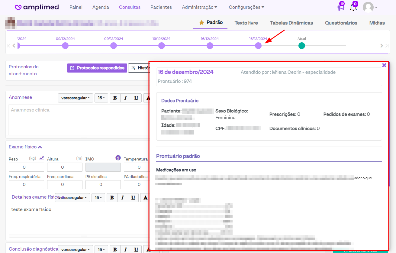 Nesta parte do prontuário, é possível visualizar os atendimentos anteriores do paciente. Ao clicar sobre uma data na linha do tempo, será possível acessar as informações do prontuário referentes à data selecionada.