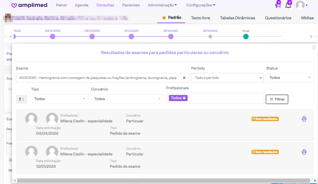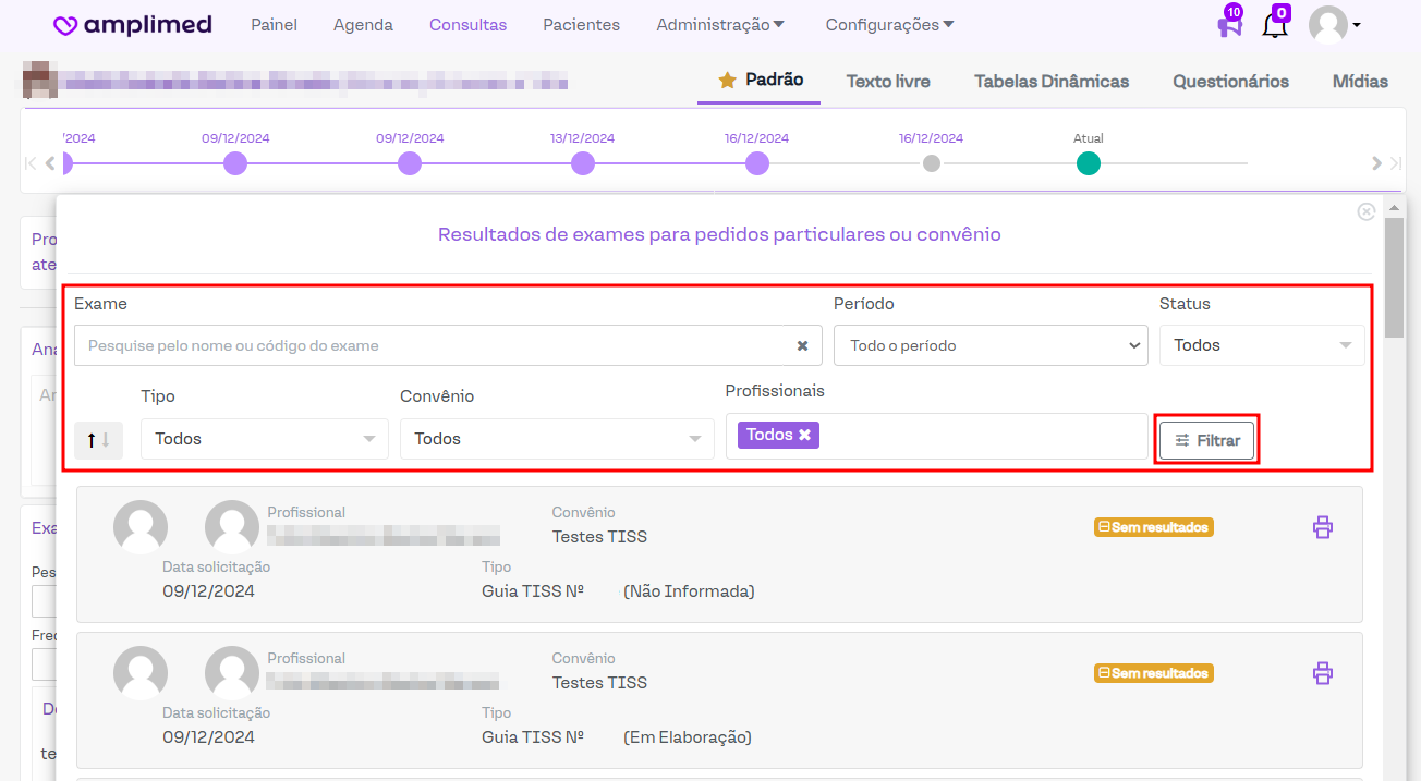 Na seção destacada na imagem acima, estão os campos que permitem refinar os resultados dos exames do paciente. Após preencher os filtros conforme desejado, basta clicar no botão Filtrar.