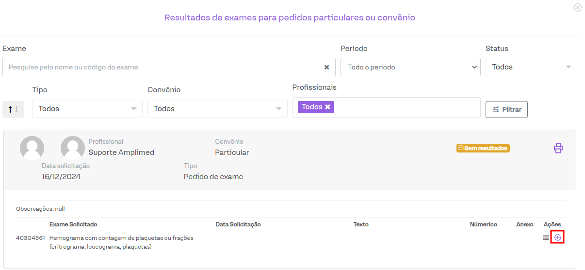Para visualizar um resultado, basta clicar sobre o exame desejado. Para incluir o resultado de um exame, clique no ícone "+", conforme destacado na imagem a seguir.