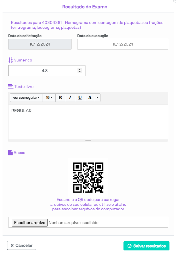 Uma nova janela será aberta, onde é possível incluir o valor numérico referente ao resultado do exame, a data de execução, observações do exame e anexar arquivos.