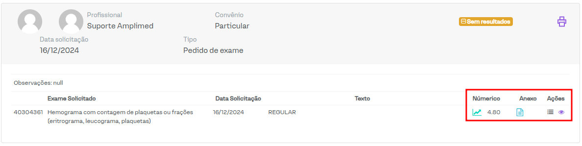 Ações: O ícone de barras horizontais permite visualizar os resultados dessa solicitação de exame, e o ícone no formato de olho permite visualizar e editar os resultados lançados.