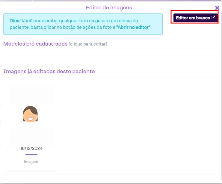 Permite realizar edições nas imagens do paciente, caso seja necessário para o atendimento. Ao clicar em Editor de Imagens, uma nova janela será aberta. Para acessar o editor, basta clicar em uma imagem ou no botão Editor em branco.