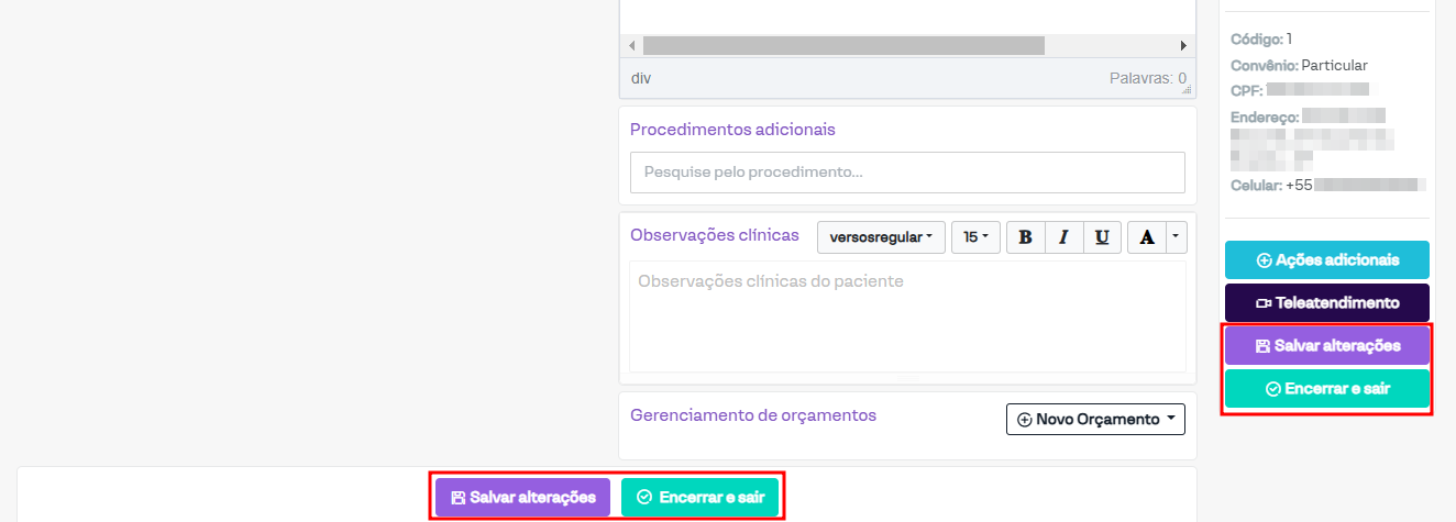Para salvar as informações preenchidas, basta clicar no botão Salvar alterações (realiza o salvamento sem fechar o prontuário), ou em Encerrar e sair (o qual encerra o prontuário, retornando para a página Consultas).