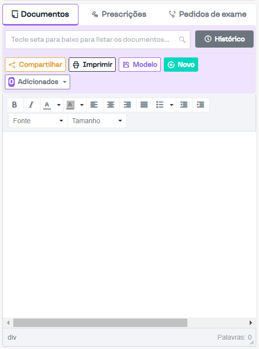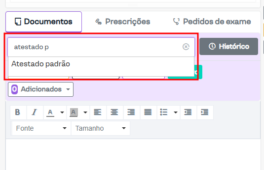 Para documentos e prescrições simples, há uma caixa de texto que permite redigir o conteúdo. No entanto, também é possível cadastrar modelos de documentos/prescrições no sistema e selecioná-los no campo destacado na imagem abaixo.