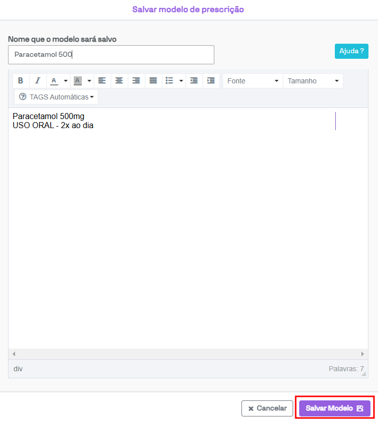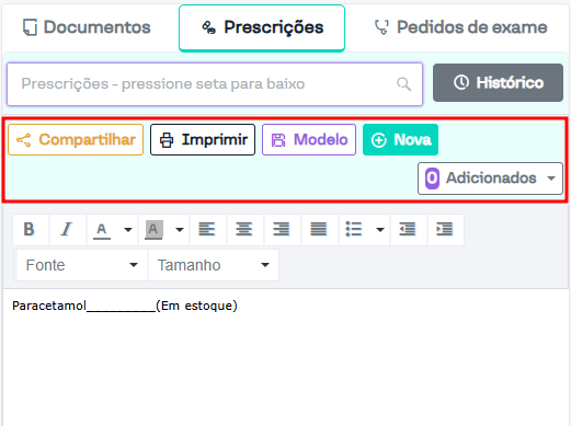 Modelo: Permite criar um novo modelo de documento/prescrição com o conteúdo preenchido na caixa de texto. Ao clicar neste botão, será solicitado o título do modelo.