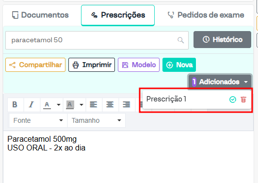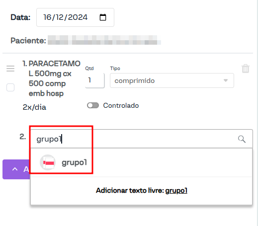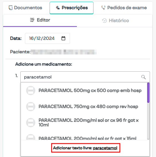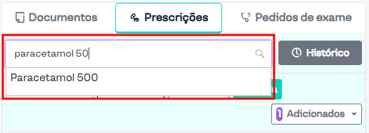 Para prescrições estruturadas, é possível selecionar os medicamentos pré-cadastrados no sistema, conforme a imagem a seguir.