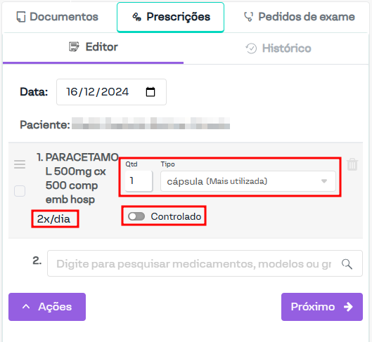 Após selecionar o medicamento desejado, é possível ajustar a quantidade, o tipo de medicamento (forma de apresentação), a posologia e se o medicamento é ou não controlado.