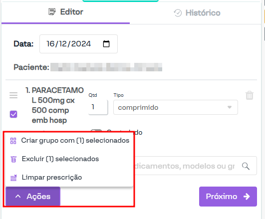 Além disso, algumas ações podem ser realizadas nos medicamentos inseridos na prescrição ao clicar no botão Ações: