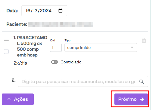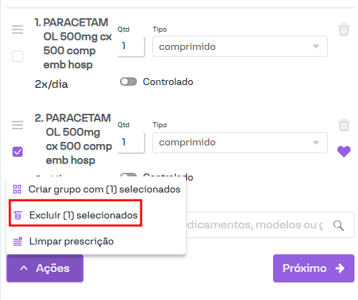 Excluir selecionados: Permite excluir os medicamentos selecionados da prescrição, conforme as imagens a seguir.