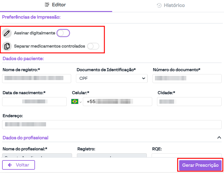 Na próxima etapa, serão solicitadas preferências de impressão, informações do paciente e do profissional.