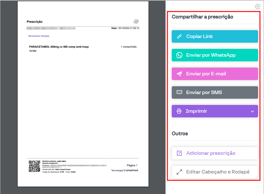 Na lateral direita, serão apresentadas maneiras de compartilhar a prescrição. O botão Adicionar prescrição abrirá o campo de prescrições para criar uma nova prescrição, e a opção Editar Cabeçalho e Rodapé levará para a seção do sistema que permite configurar as impressões da clínica.