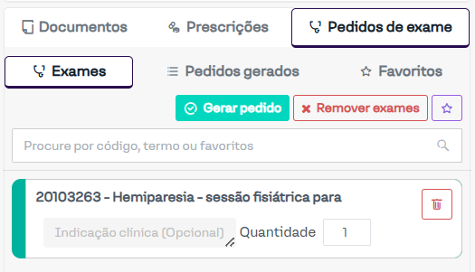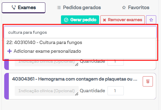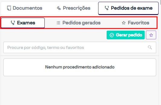 Nos pedidos de exame, esta seção é dividida em três partes: Exames, Pedidos gerados e Favoritos.