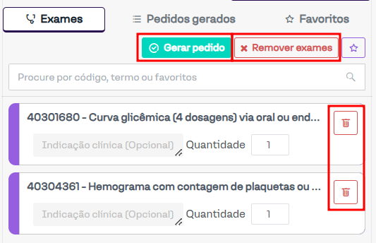 Após selecionar os exames, basta clicar no botão Gerar pedido, caso esteja de acordo. Se necessário, é possível excluir os exames clicando no botão em formato de lixeira ou no botão Remover exames.