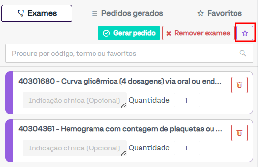 Além disso, ao clicar no botão em formato de estrela, é possível favoritar o grupo de exames do pedido.
