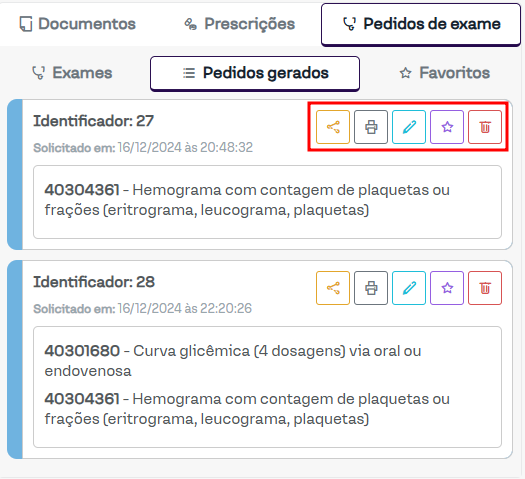 Ícone em forma de lápis: Permite editar o pedido de exames, abrindo-o novamente na aba Exames. Para salvar os ajustes, basta clicar em Gerar pedido.