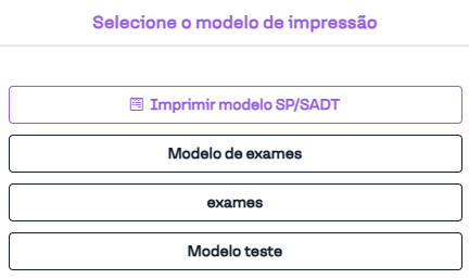 Ícone de impressora: Permite imprimir o pedido de exames. Essa opção de impressão permite, além dos modelos de exame cadastrados, imprimir também no modelo SP/SADT, conforme a imagem a seguir.