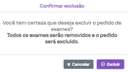 Ícone em forma de lixeira: Remove o pedido de exames do prontuário. Antes, aparecerá uma mensagem de confirmação da ação, conforme a imagem a seguir.