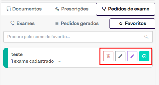 Ícone com fundo verde: Permite utilizar o grupo de favoritos em uma nova solicitação de exames. Ao clicar neste botão, você será levado à aba Exames, com os exames já preenchidos.