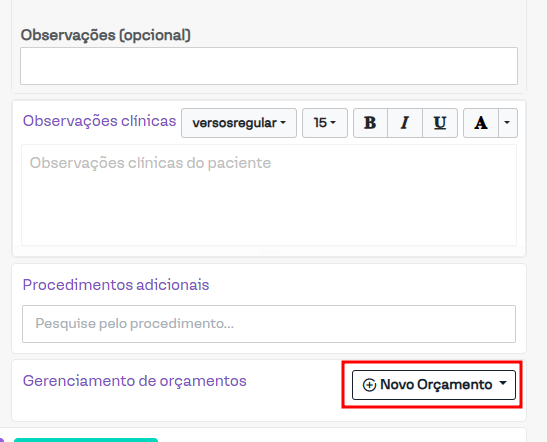 Dando sequência aos demais campos do prontuário, o campo orçamentos permite realizar um orçamento para o paciente diretamente pelo prontuário.