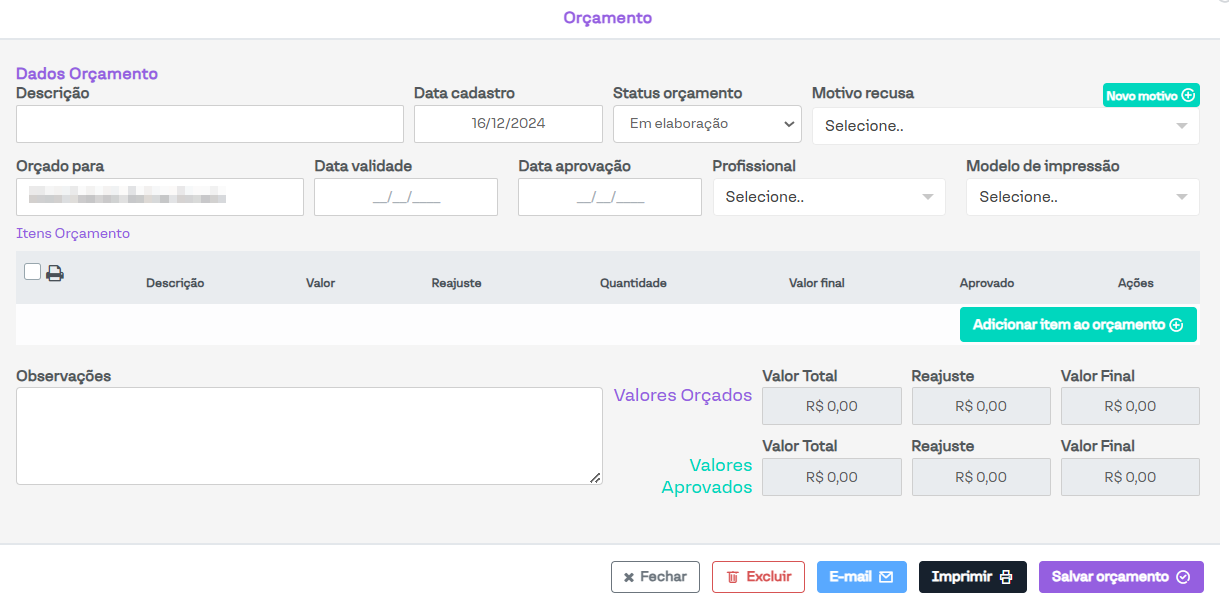 Ao clicar no botão Novo orçamento, será aberta uma janela conforme a imagem a seguir.