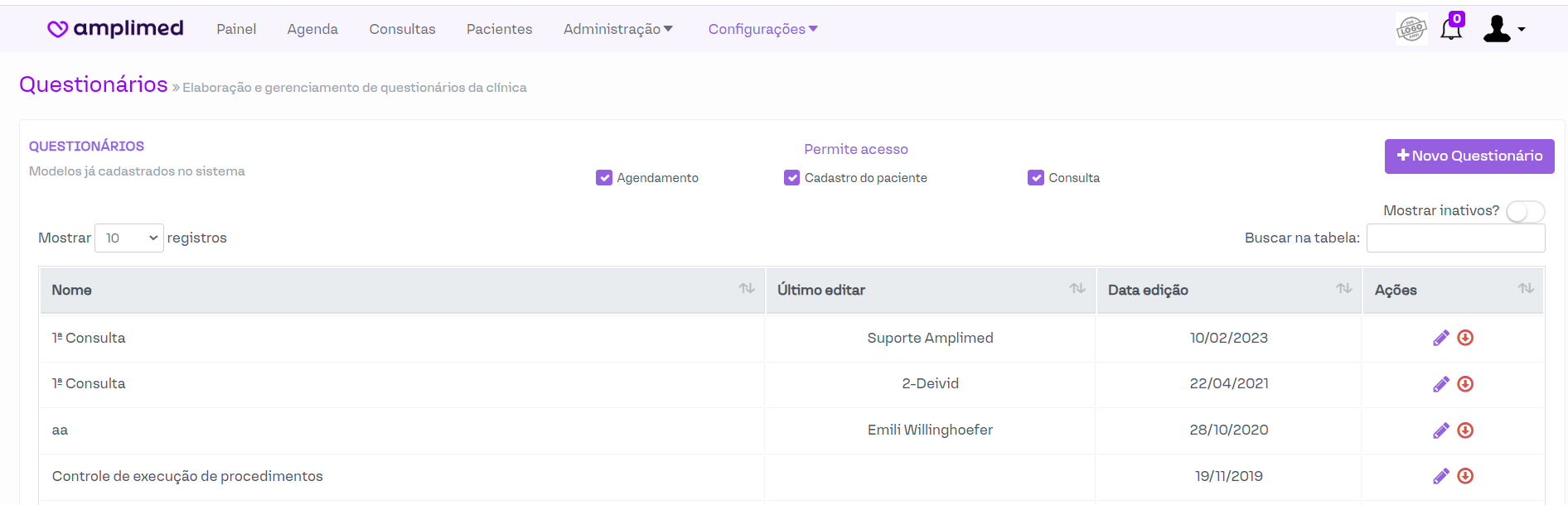 Nesta tela será demonstrada a listagem de todos os questionários já criados e para a sua clínica.