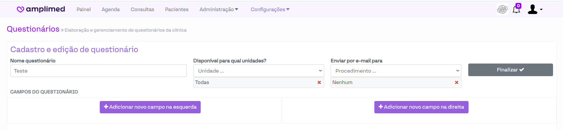 Criar um novo questionário é bem semelhante ao processo de cadastro de campos no prontuário eletrônico. Deve ser definido o nome do questionário, a(s) unidade(s) em que ele ficará disponível e em qual procedimento ele deve ficar vinculado. Dessa forma, podem ser definidos questionários diferentes para cada tipo de procedimento que serão enviados ao paciente sempre que este procedimento for selecionado no agendamento.