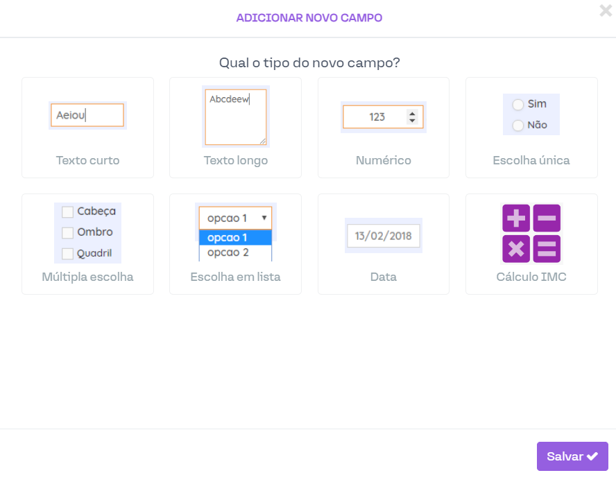 Após o preenchimento dos parâmetros acima, deve-se realizar a inclusão dos campos que irão compor as perguntas. Os campos podem ser adicionados tanto a direita quanto a esquerda e são vários modelos disponíveis que permitem maior flexibilidade no momento de montar o layout.