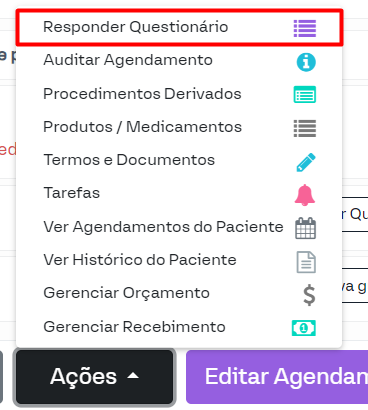 1) Agendamentos: cria atalho dentro do agendamento, no botão "Ações" para responder o questionário: